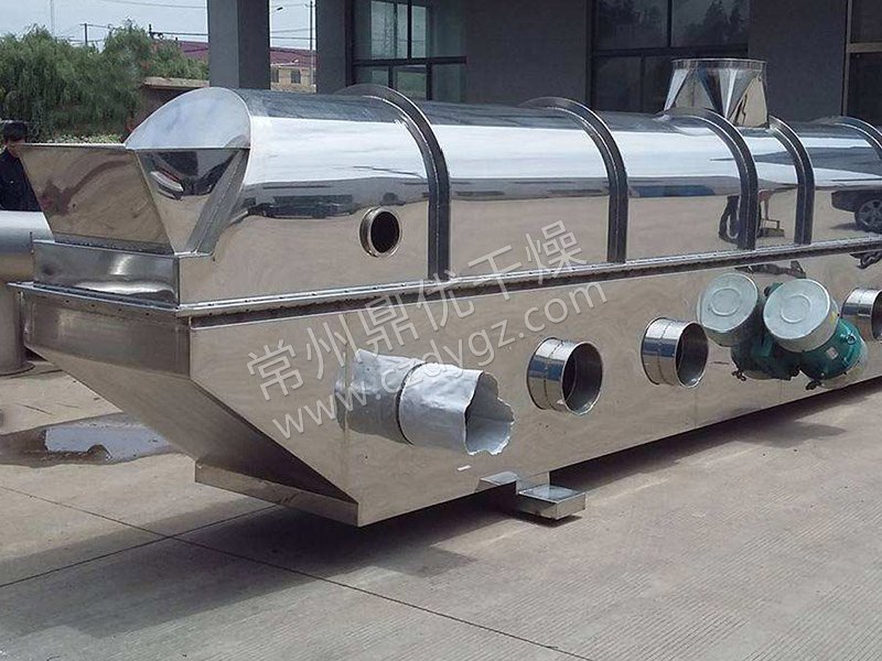 物料自进料进口进入机内,在振动力作用下,物料沿水平面流化床抛掷,向前连续运动,热风向上穿过流化床同湿物料换热后,湿空气经旋风分离器除尘后由排风1:3排出。干燥物料由排料进口排出。